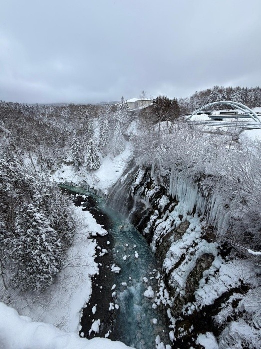 富良野では、「白ひげの滝」を訪れました。雪に囲まれた滝の景色は非常に幻想的で、現実とは思えないほど美しく、まさに“隠れた楽園”と呼ぶにふさわしい場所でした。